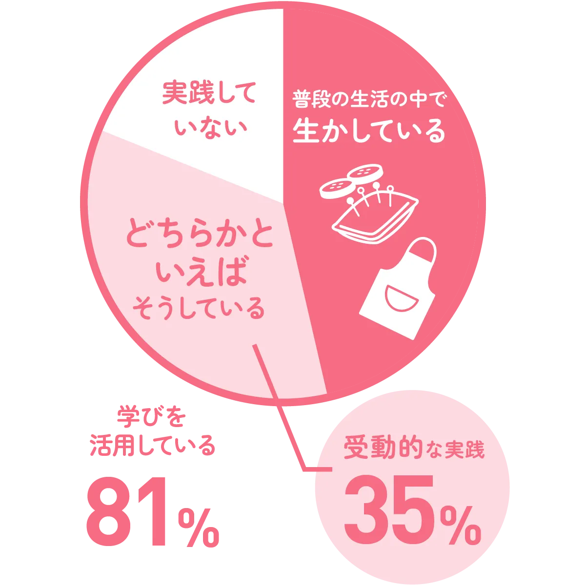 家庭科の学びを生活に活用している児童は81.3%に達しますが、その実態は一様ではありません。自信を持って「実践している」と答えた積極層は46.4%にとどまり、残る34.9%は受動的な段階にあります。知識を「確かな習慣」へと昇華させるための動機付けが、今後の教育的課題といえます。