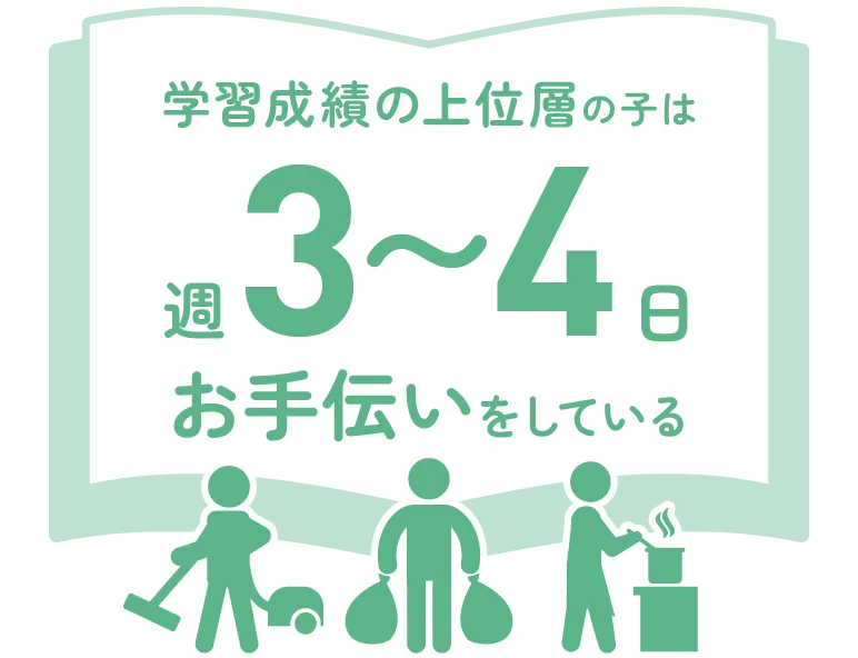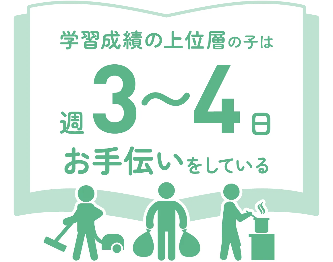 学習成績の上位層ほど、週に3〜4日以上の頻度でお手伝いをしているというデータがあります。家庭での役割を持つことは、子どもが「自分が必要とされている」という自己肯定感を生み、思いやりの心や社会性を育む大切なきっかけになります。