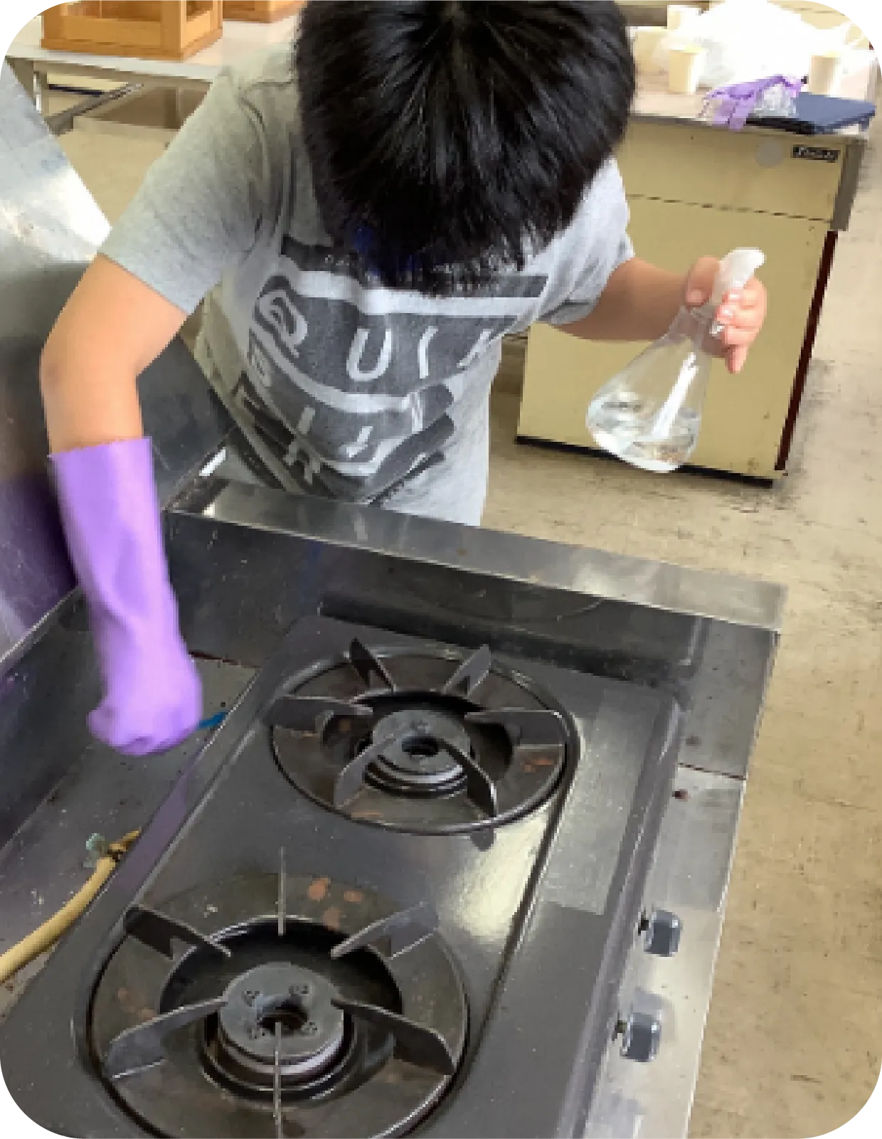 家庭科室にあるガスコンロの油汚れに取り組む児童の様子