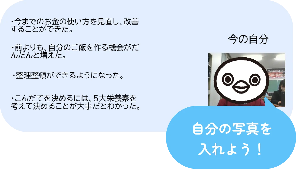 はじめに、冬休みの過ごし方について、「冬休み家庭科ビンゴ」などで共有し、「理想の自分チャレンジ」の取り組みがどうだったかを隣の子に尋ね、「『理想の自分チャレンジ』実践報告会をしよう」という課題を設定します。