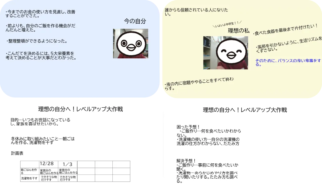 今まで習ったことを生かして、中学校進級に向けて自分でやることを増やしたり、周りの人への感謝の気持ちを表したりしよう。