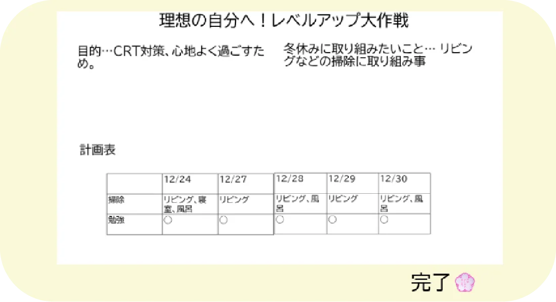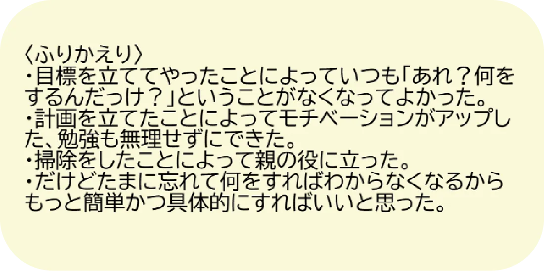 また、冬休み中の実践が難しくてできなかった子どもは土日や三連休に何か一つ取り組むなど、計画を一緒に見直し、全く取り組めない子どもがいないように配慮します。